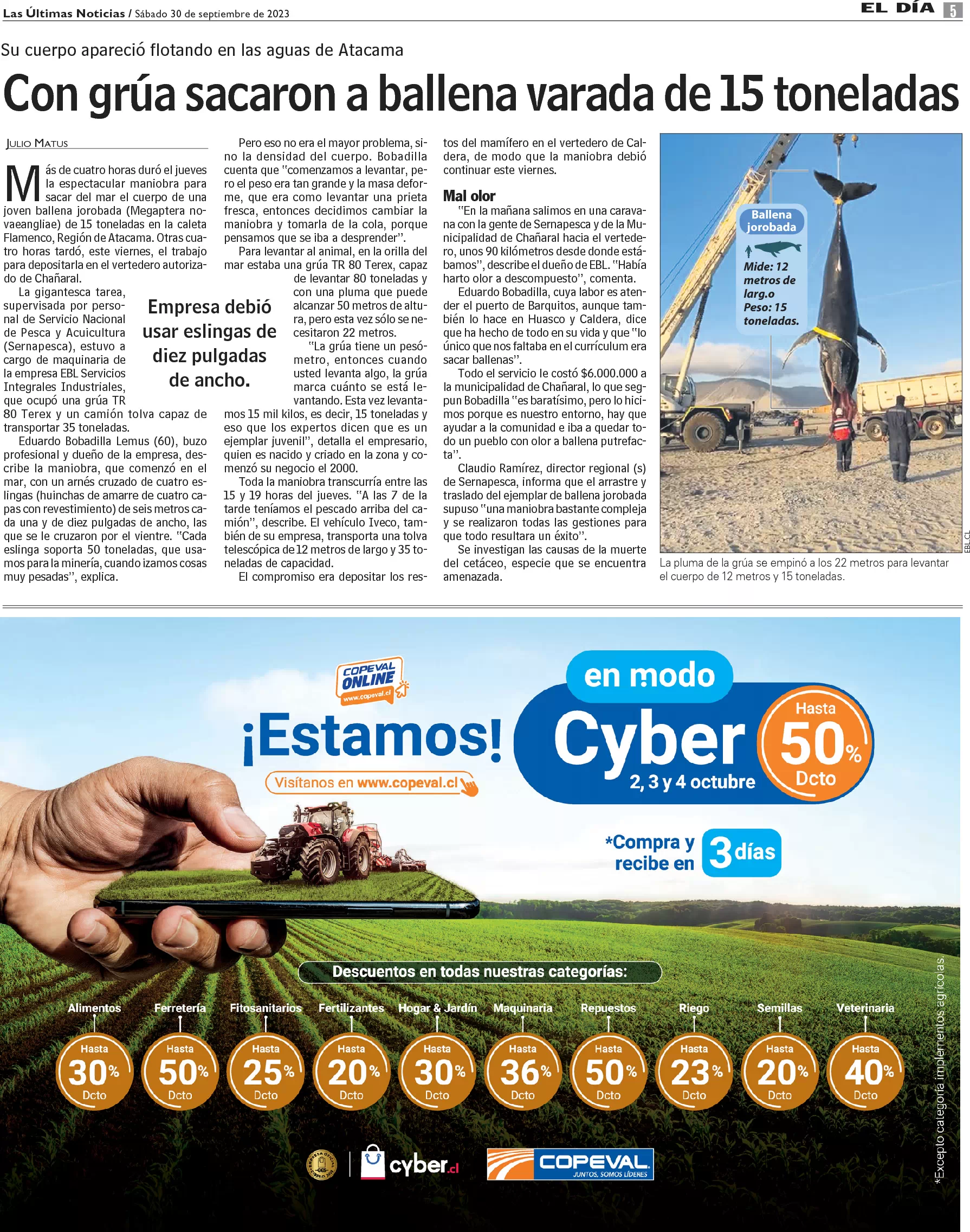 Con grúa sacaron a ballena varada de 15 toneladas