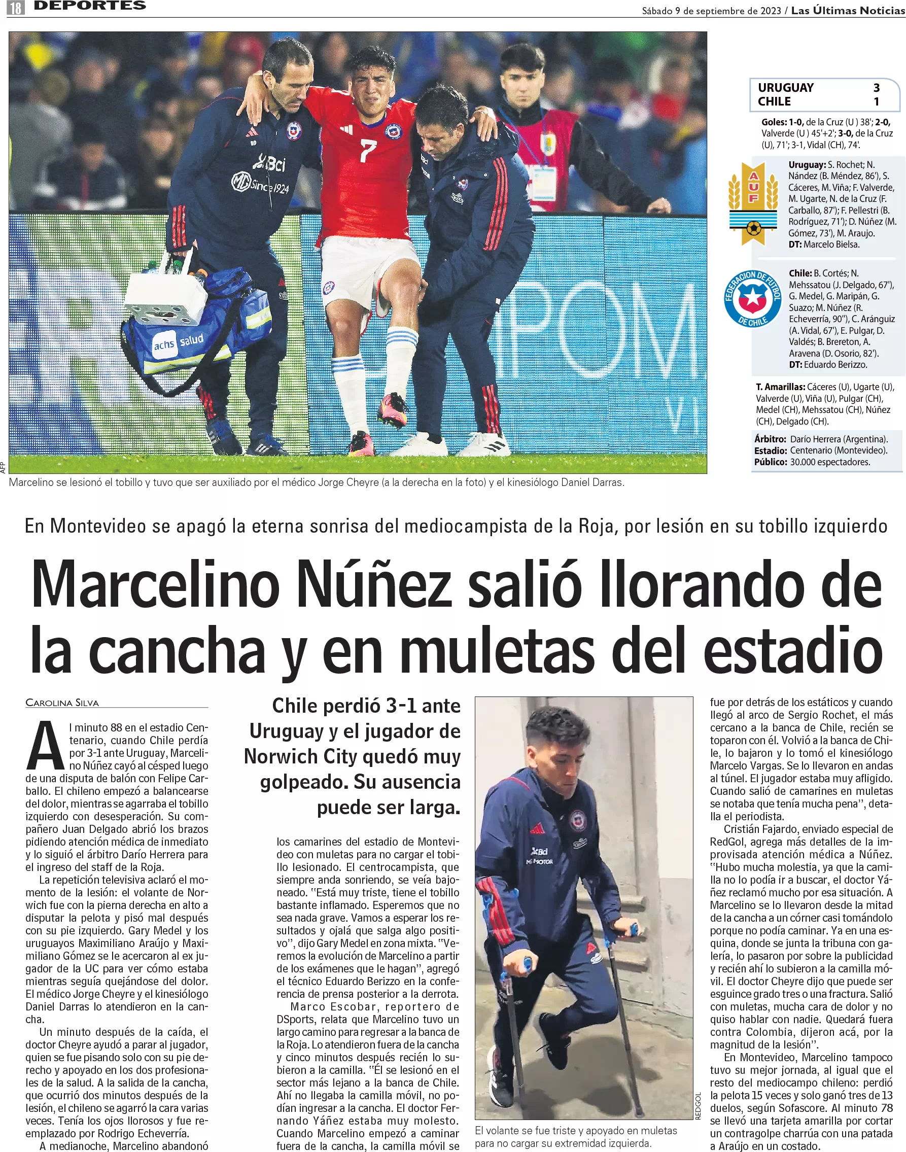 Todo mal: Chile perdió 3-1 con Uruguay y Marcelino salió lesionado
