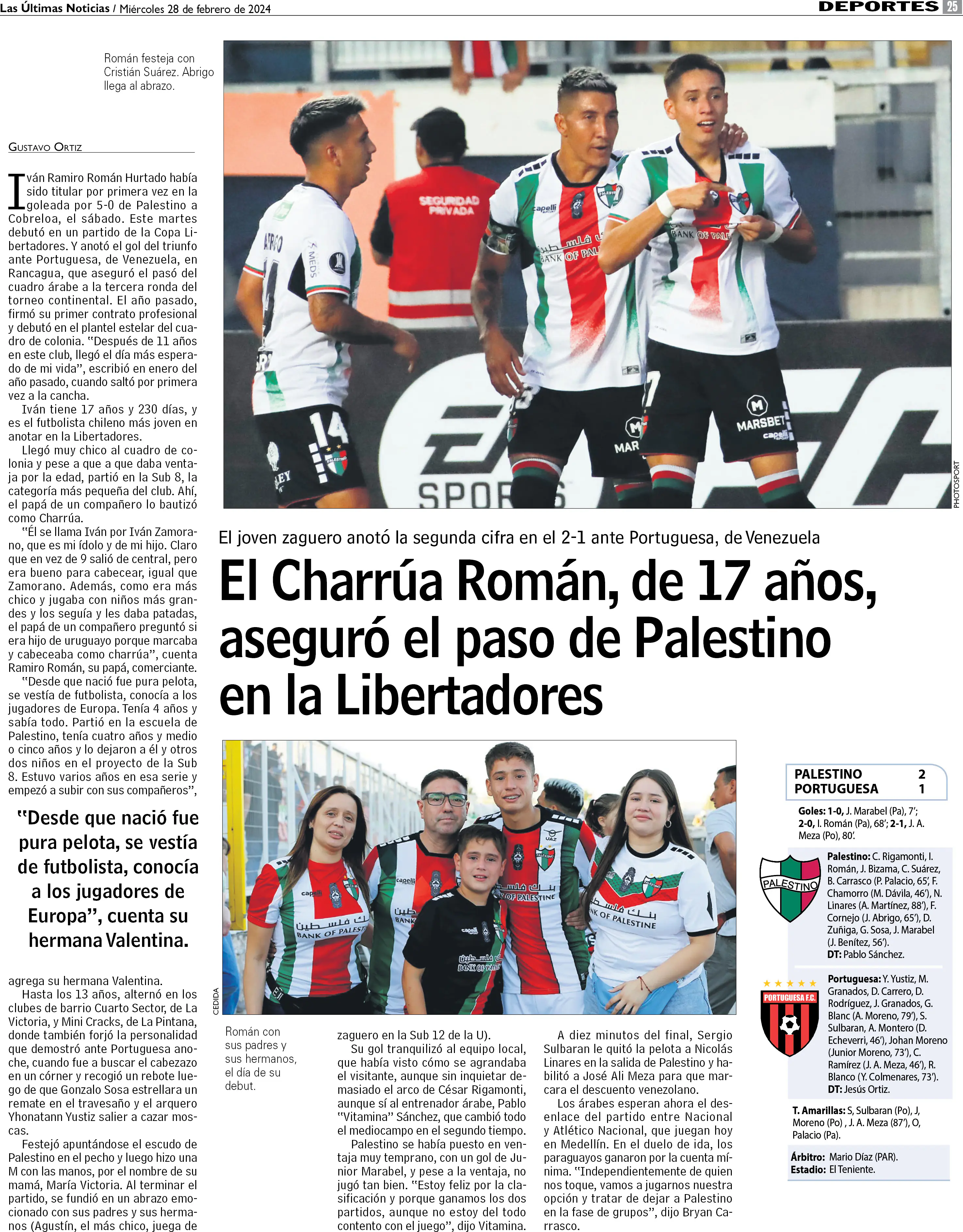 El Charrúa Román, de 17 años, aseguró el paso de Palestino en la Libertadores