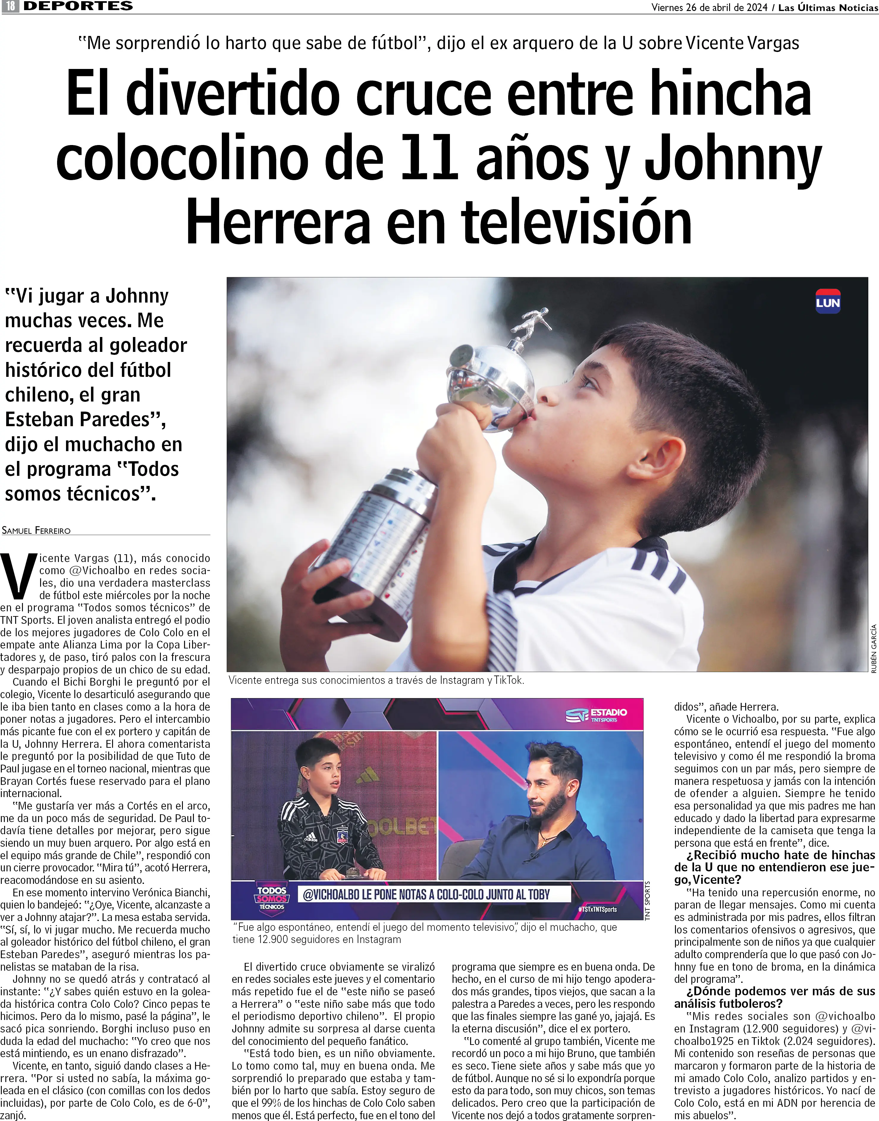 El divertido cruce entre hincha colocolino de 11 años y Johnny Herrera en televisión