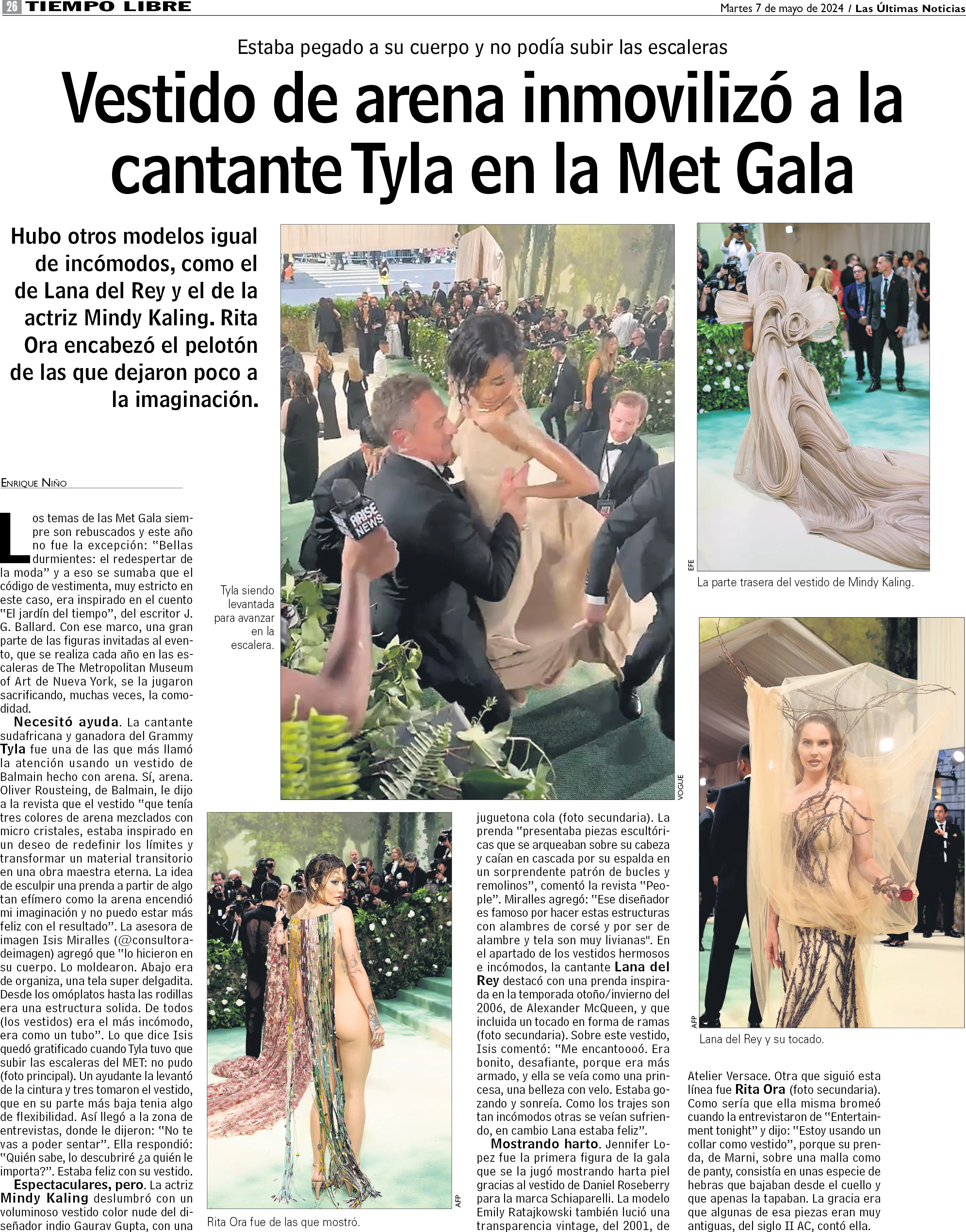 Vestido de arena inmovilizó a la cantante Tyla en la Met Gala