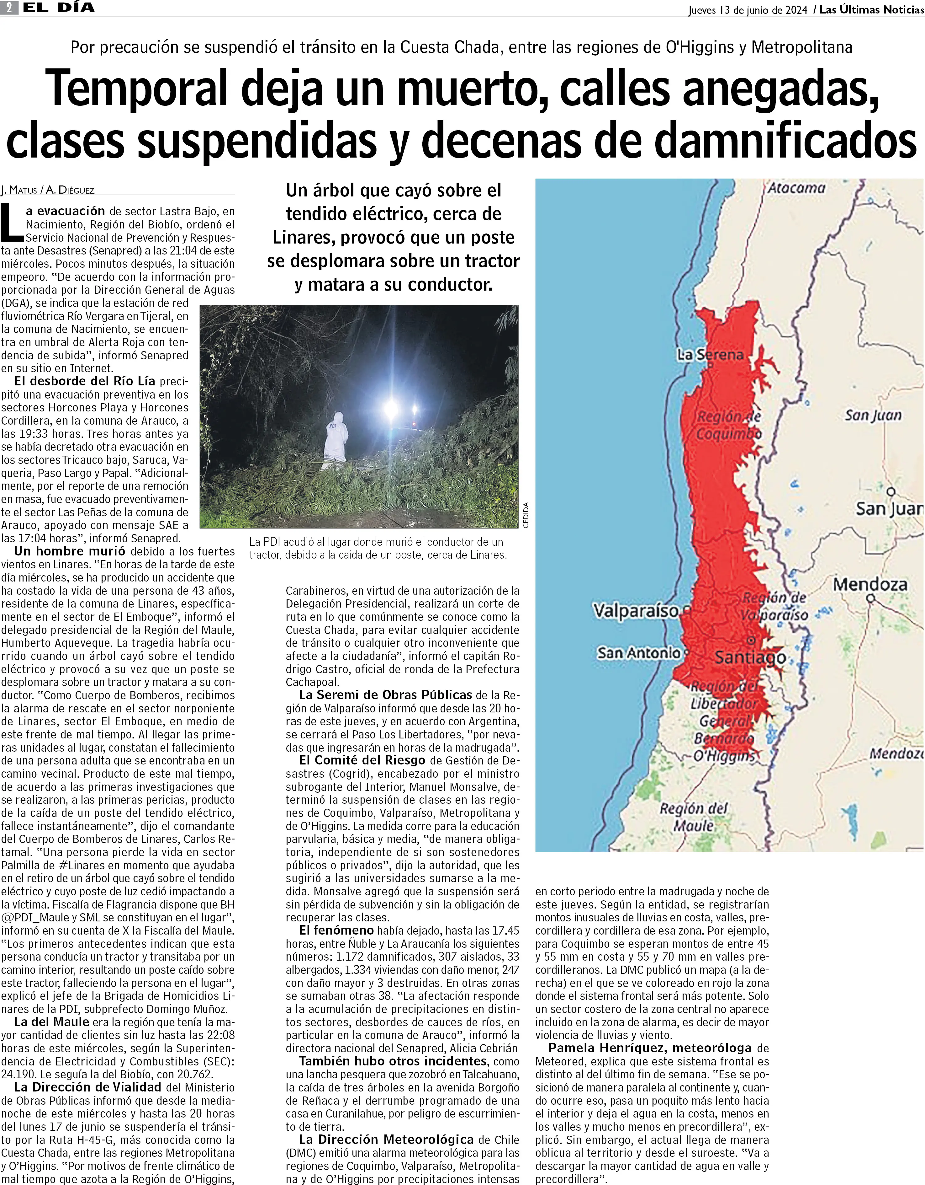 Temporal: conductor de tractor fallece tras caída de un poste en Linares