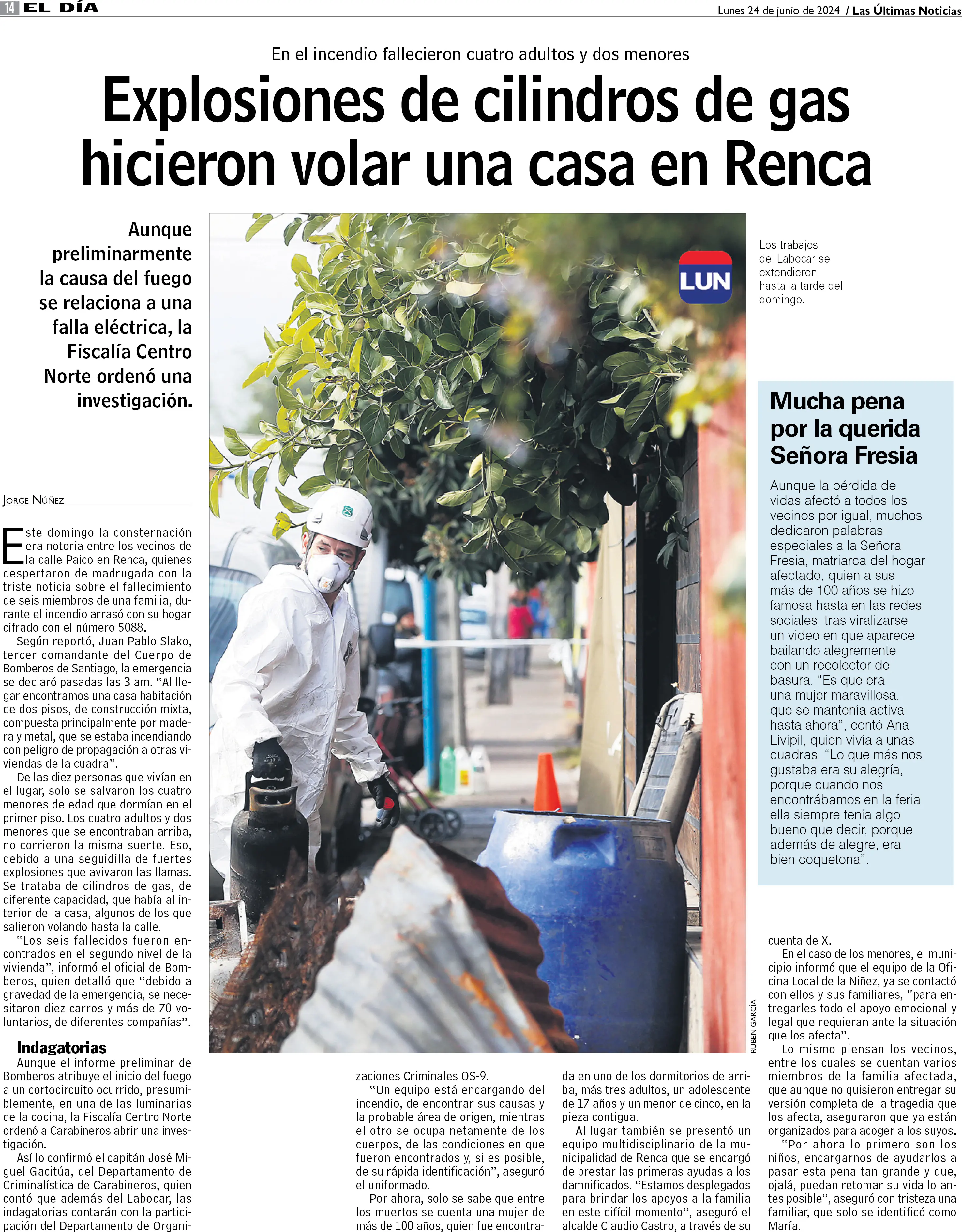 Seis muertos en incendio y explosiones de balones de gas en Renca