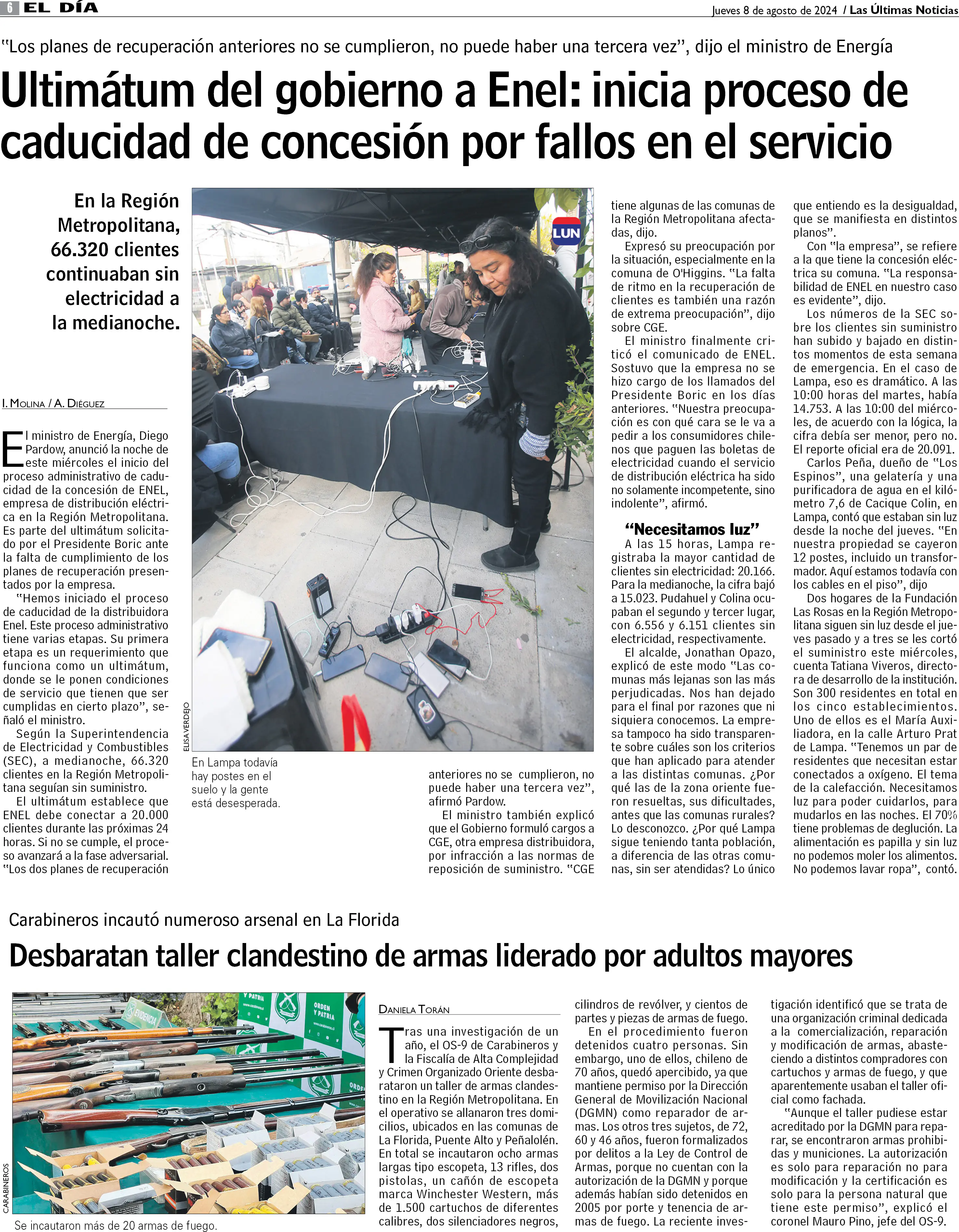 Ultimátum del gobierno a Enel: debe conectar a 20 mil clientes en 24 horas