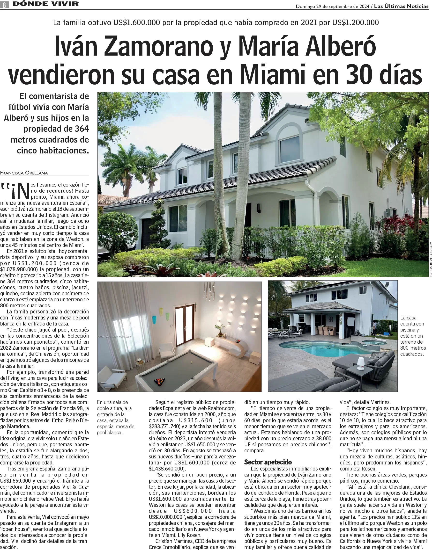 Zamorano y Alberó vendieron su casa de 364 m2 en Miami por US$ 1.600.000
