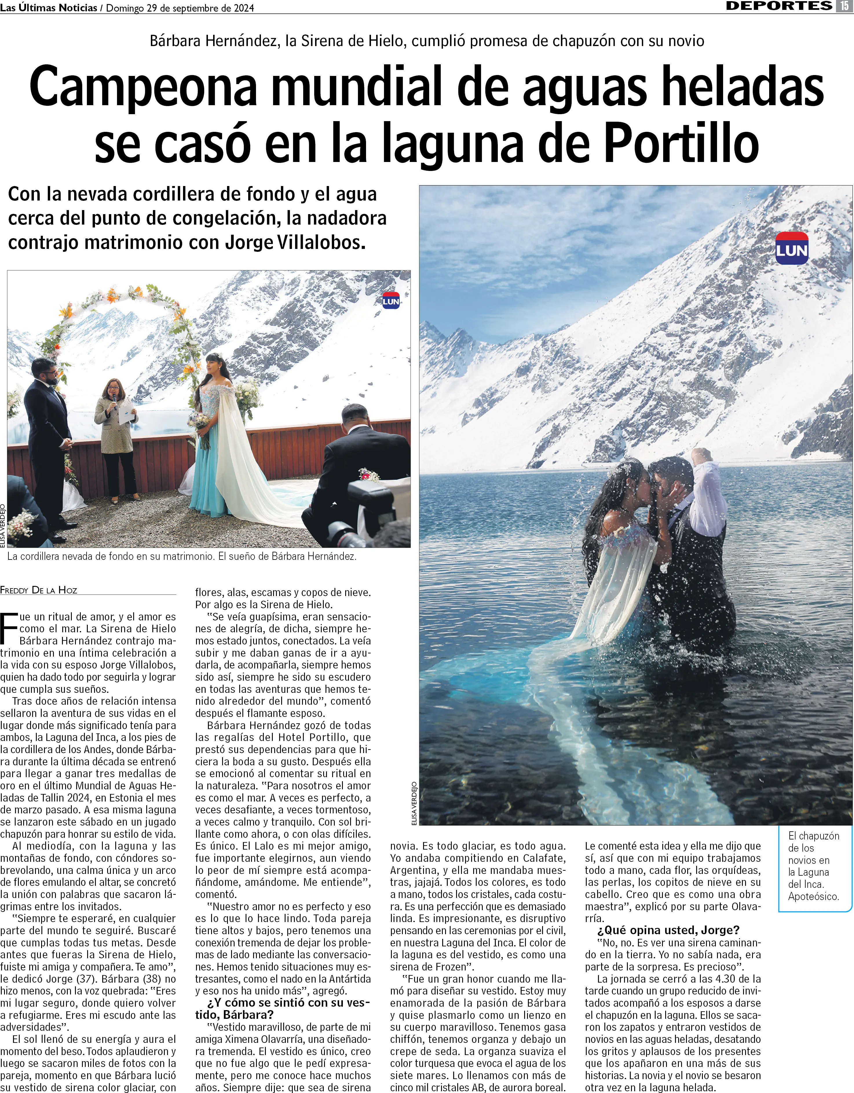 Campeona mundial de aguas heladas se casó en la laguna de Portillo