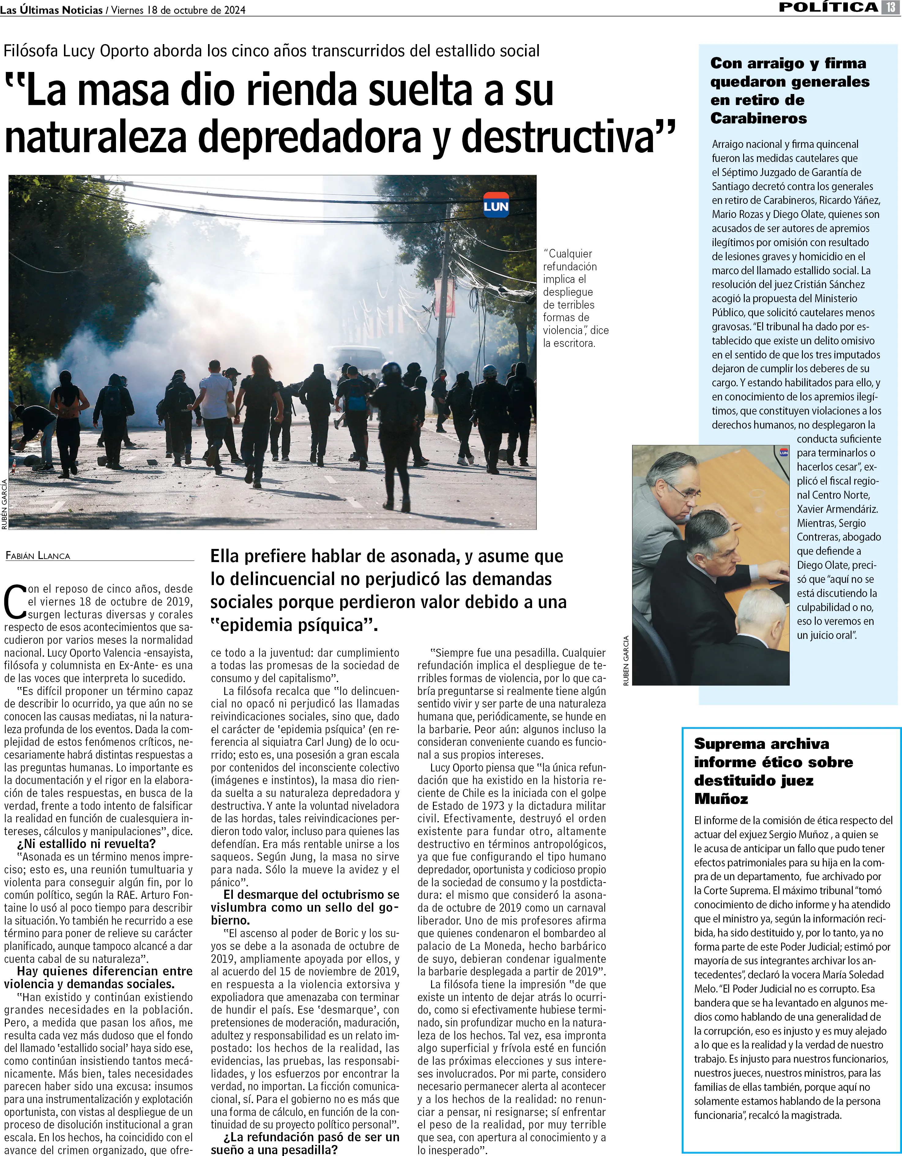 Lucy Oporto y aniversario del 18-O: "La masa dio rienda suelta a su naturaleza destructiva"