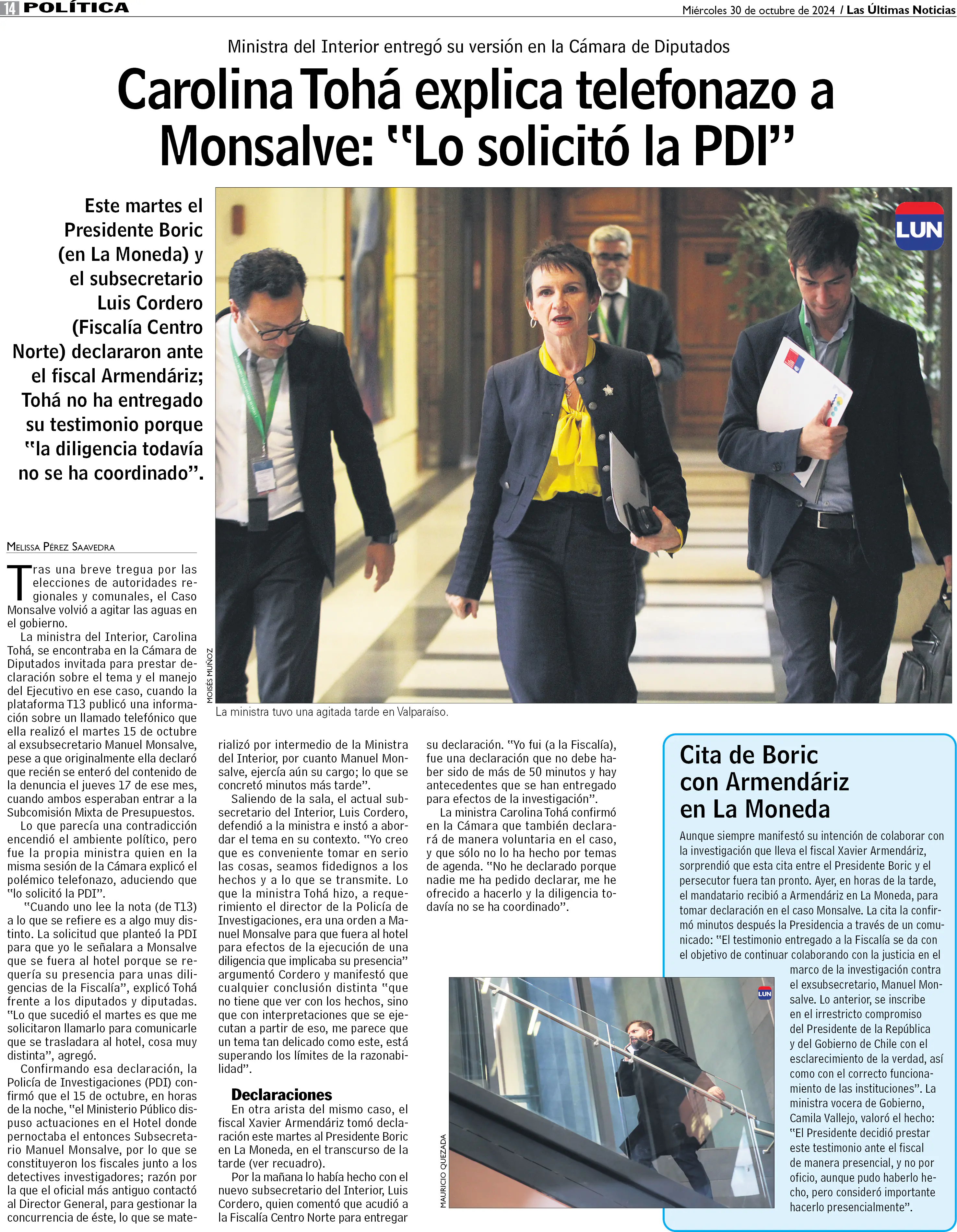Tohá explica telefonazo a Monsalve: "Lo solicitó la PDI"