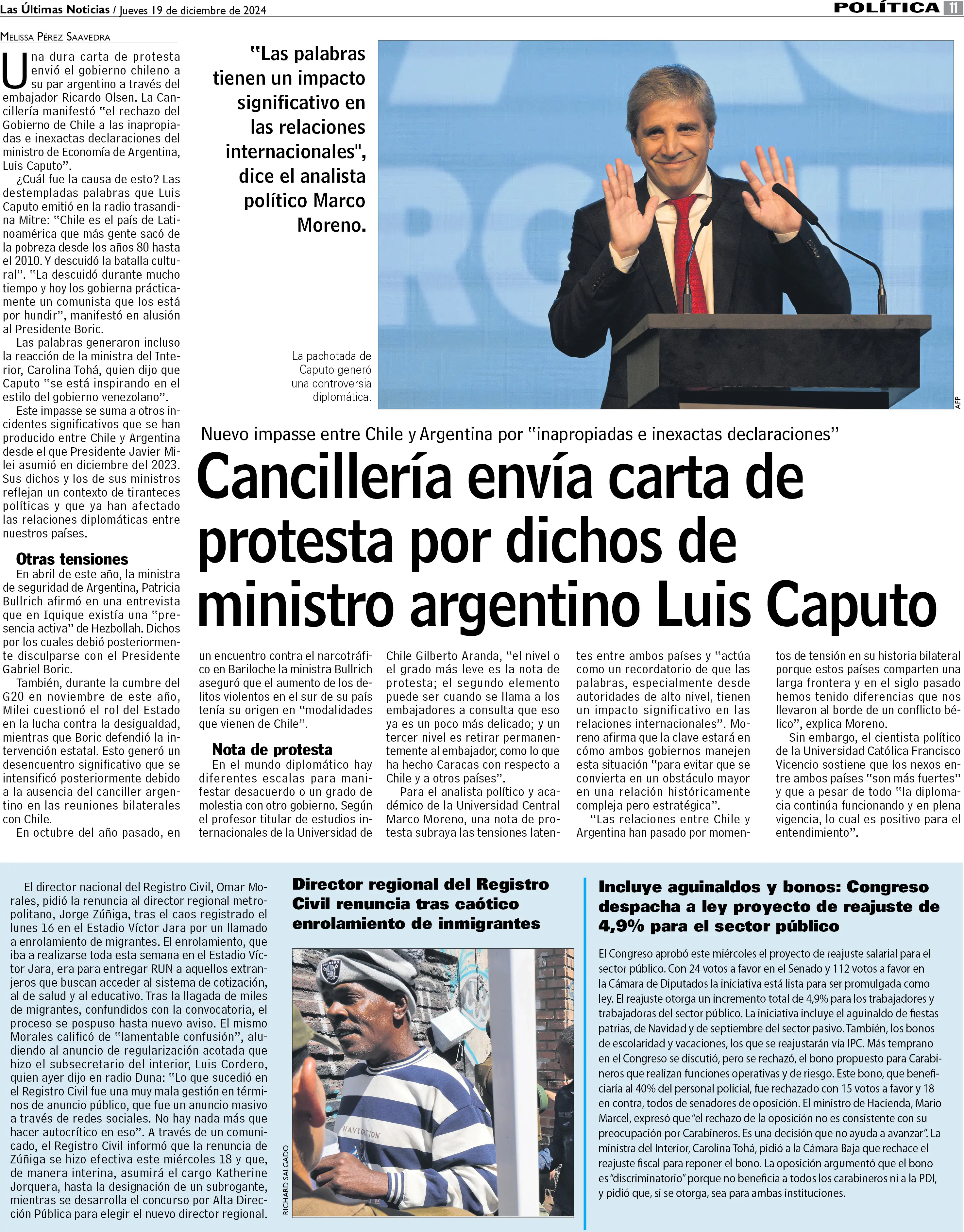 Cancillería envía carta de protesta por dichos de ministro argentino Luis Caputo