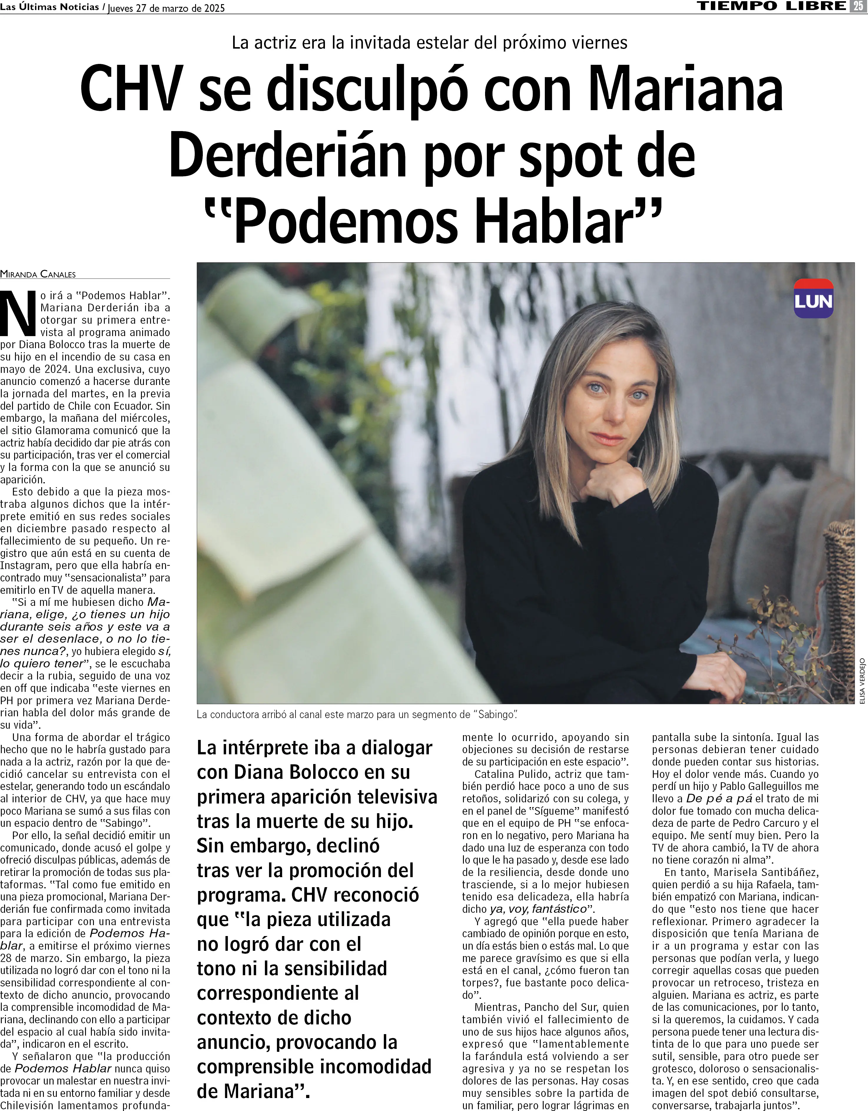 CHV se disculpa con Mariana Derderián por promocionar entrevista sin mucho tino
