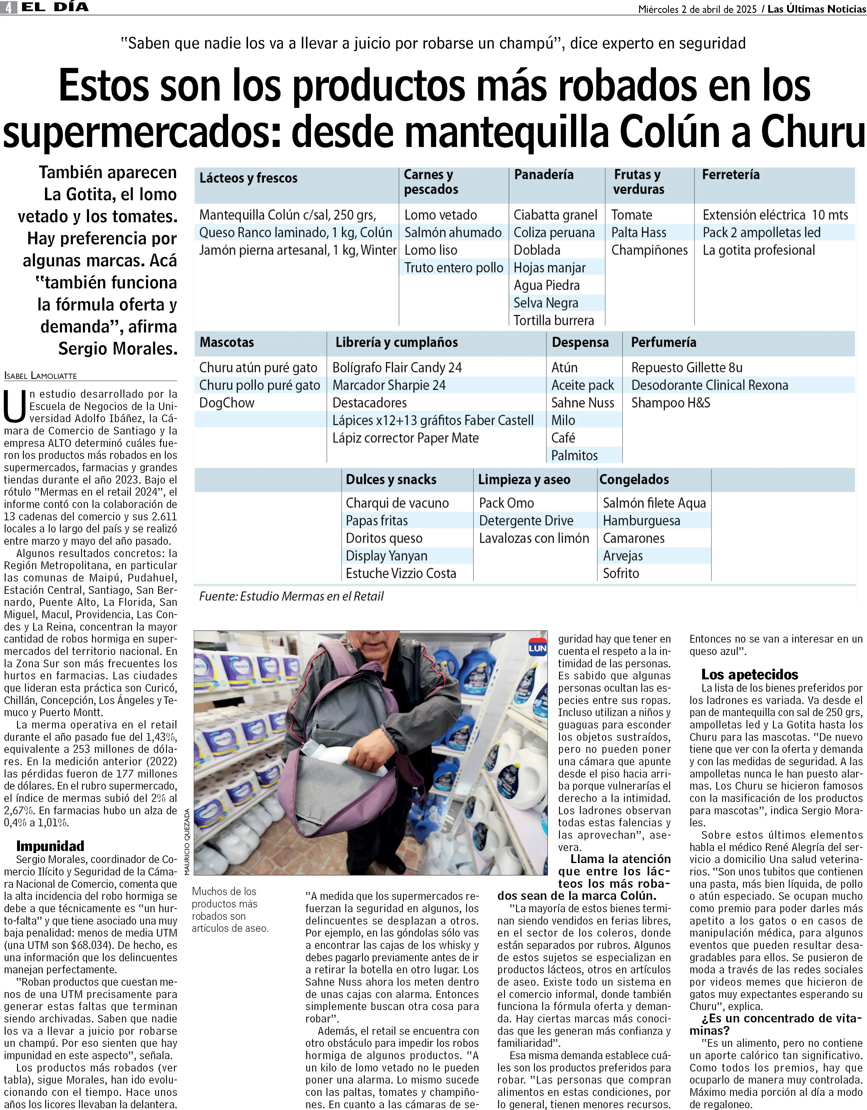 Estos son los productos más robados en los supermercados: desde mantequilla Colún a Churu