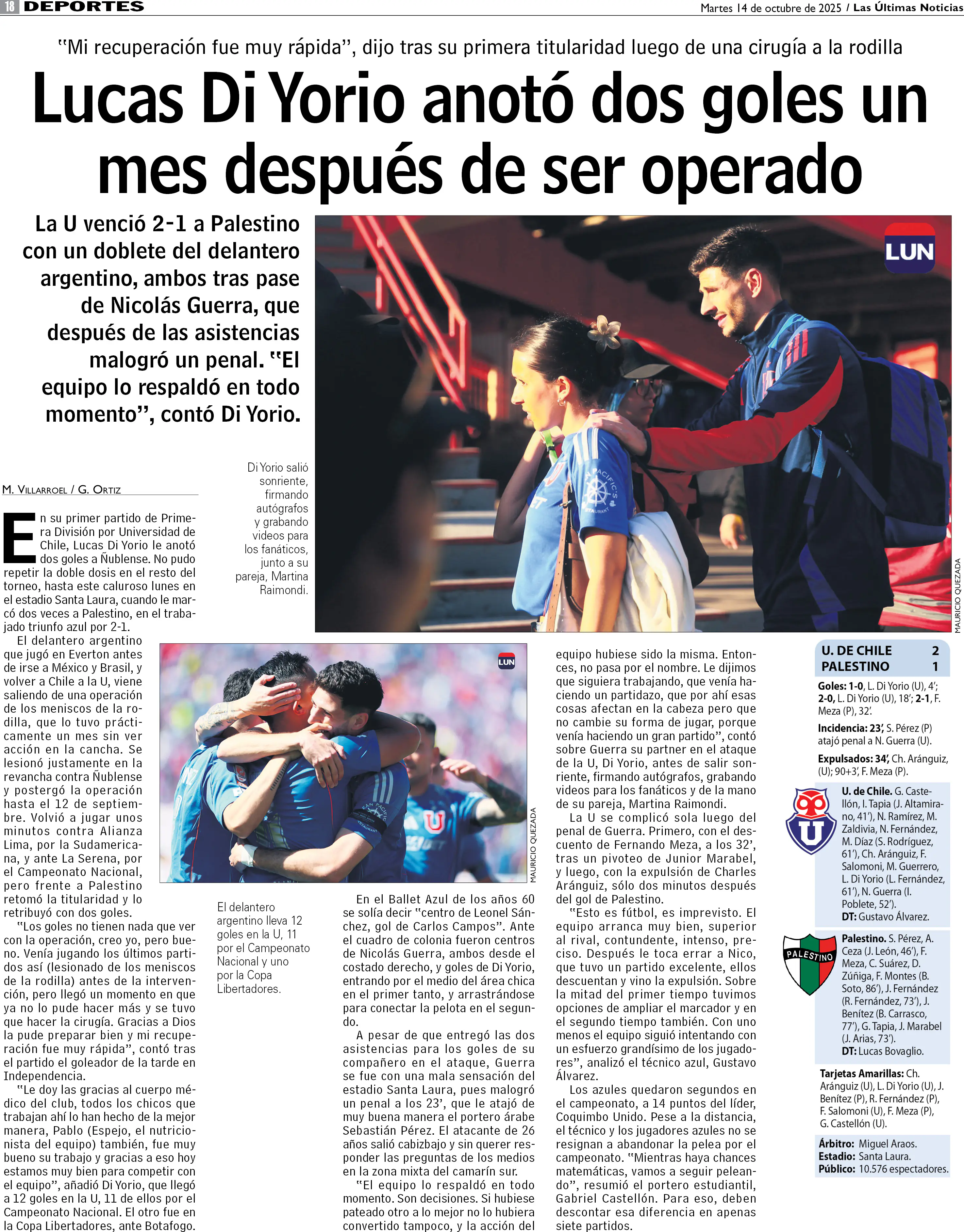 Di Yorio llenó de vida a la U a un mes de operarse: 2-1 a Palestino