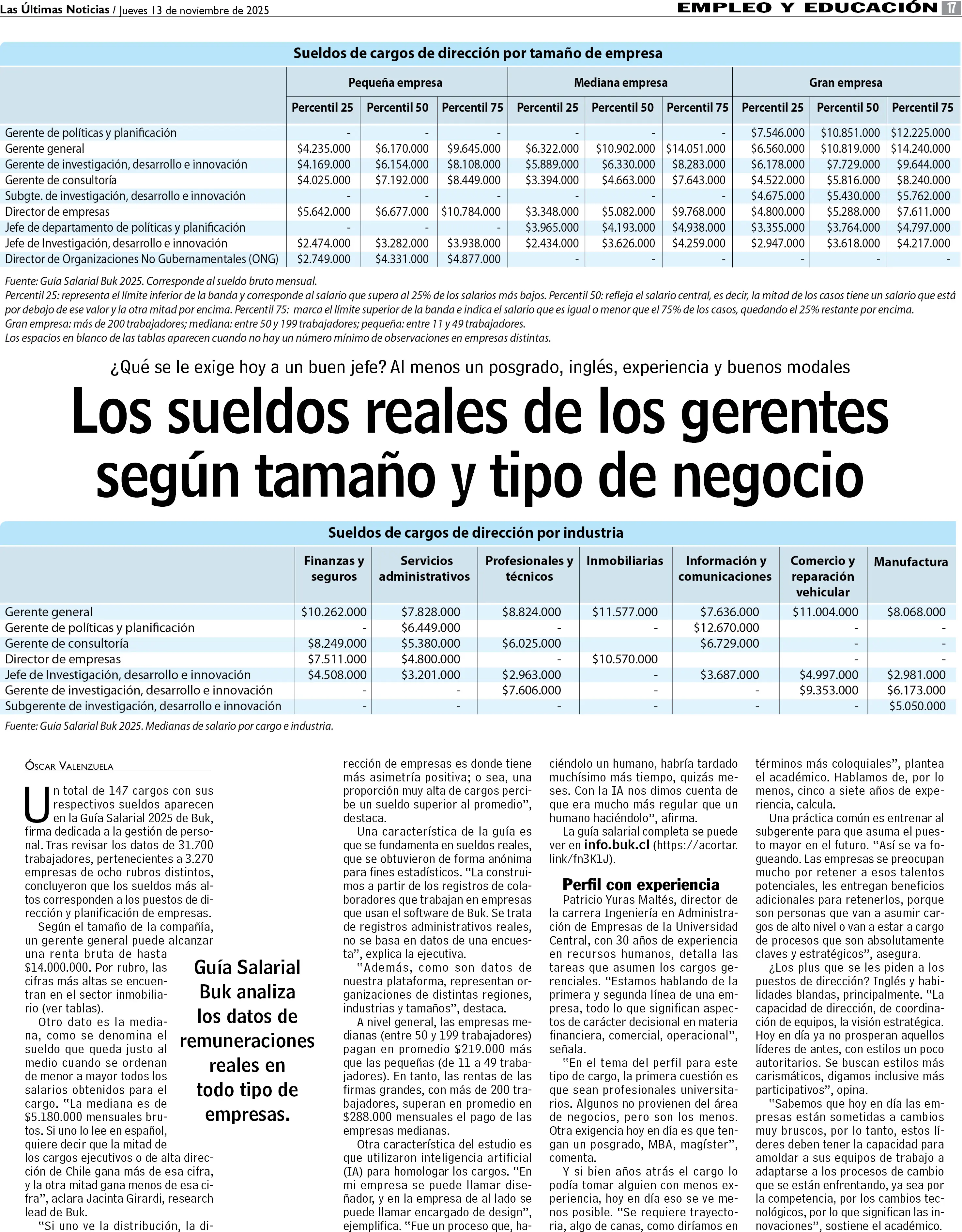 Tabla: sueldos de gerentes en Chile, según tamaño y tipo de negocio