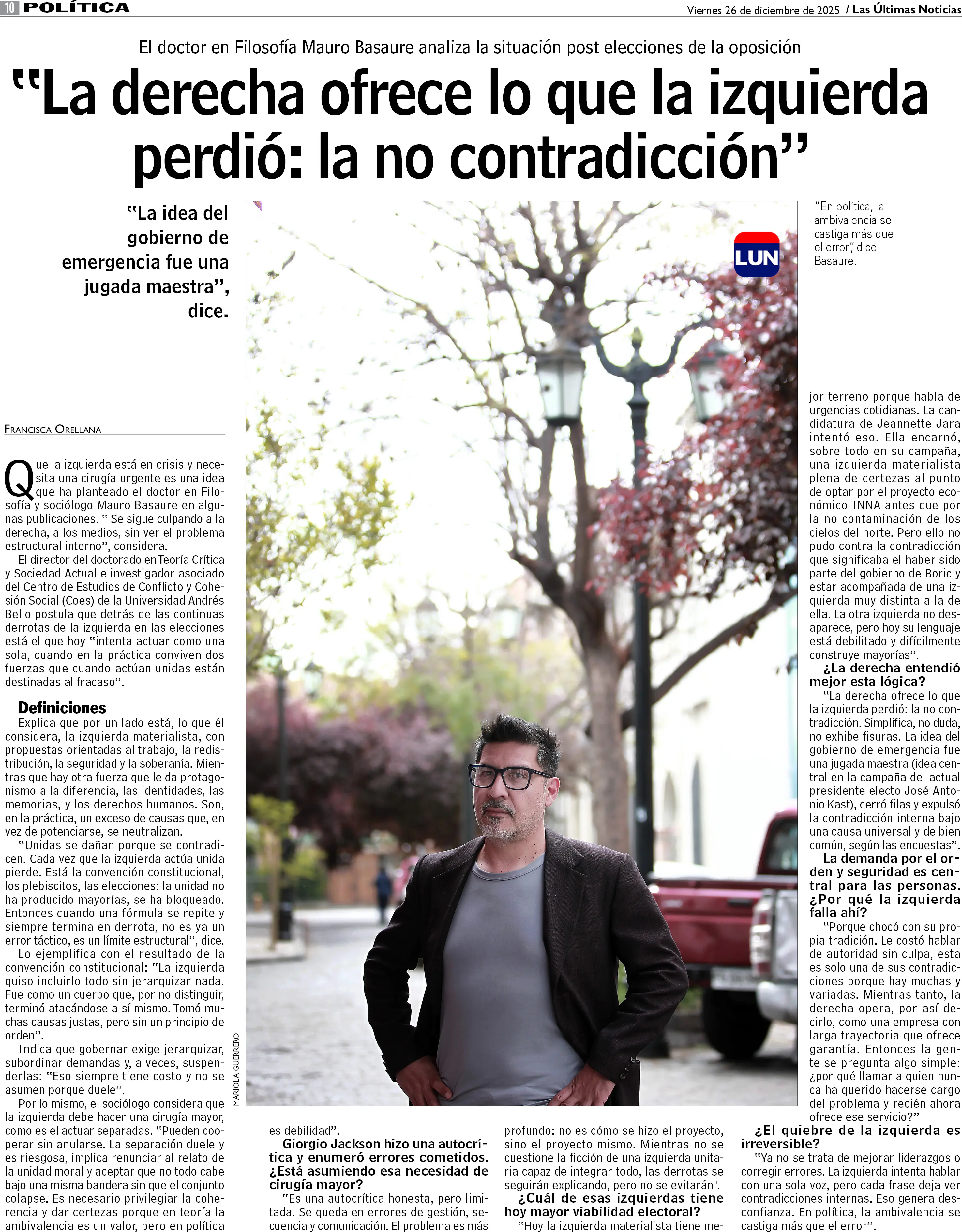 Filósofo Mauro Basaure: "La derecha ofrece lo que la izquierda perdió: la no contradicción"