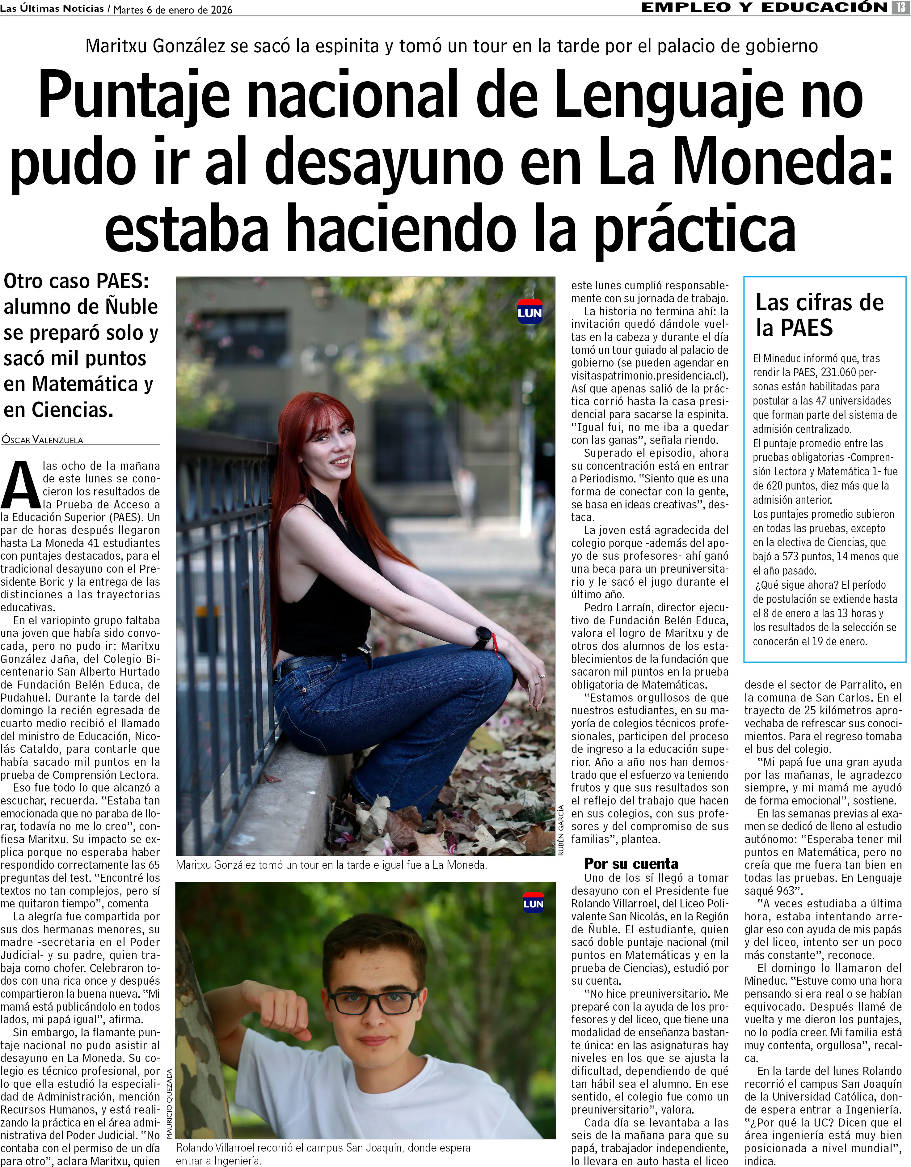 Puntaje nacional de Lenguaje no pudo ir al desayuno en La Moneda: estaba haciendo la práctica