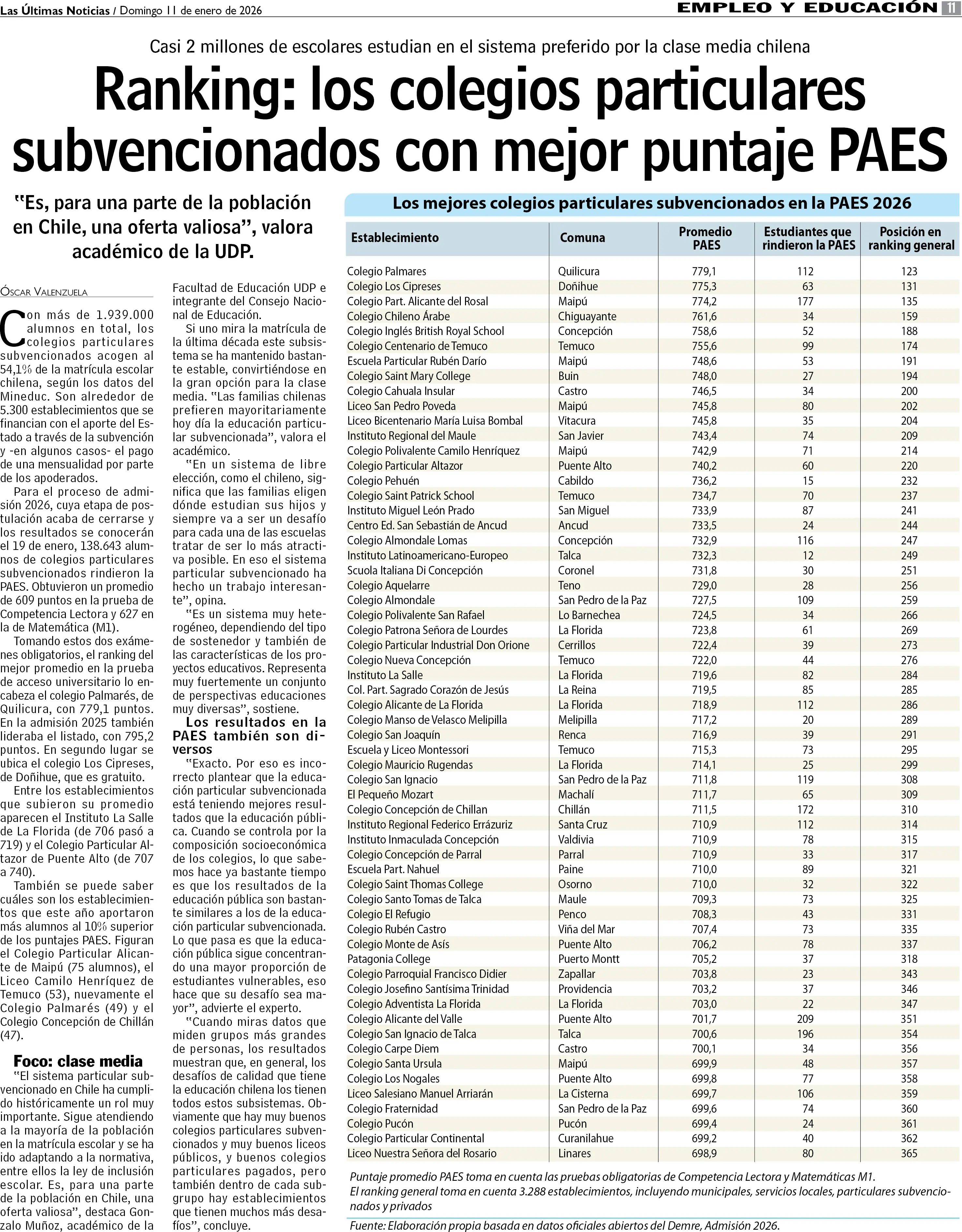 Ranking: colegios subvencionados con mejor puntaje PAES