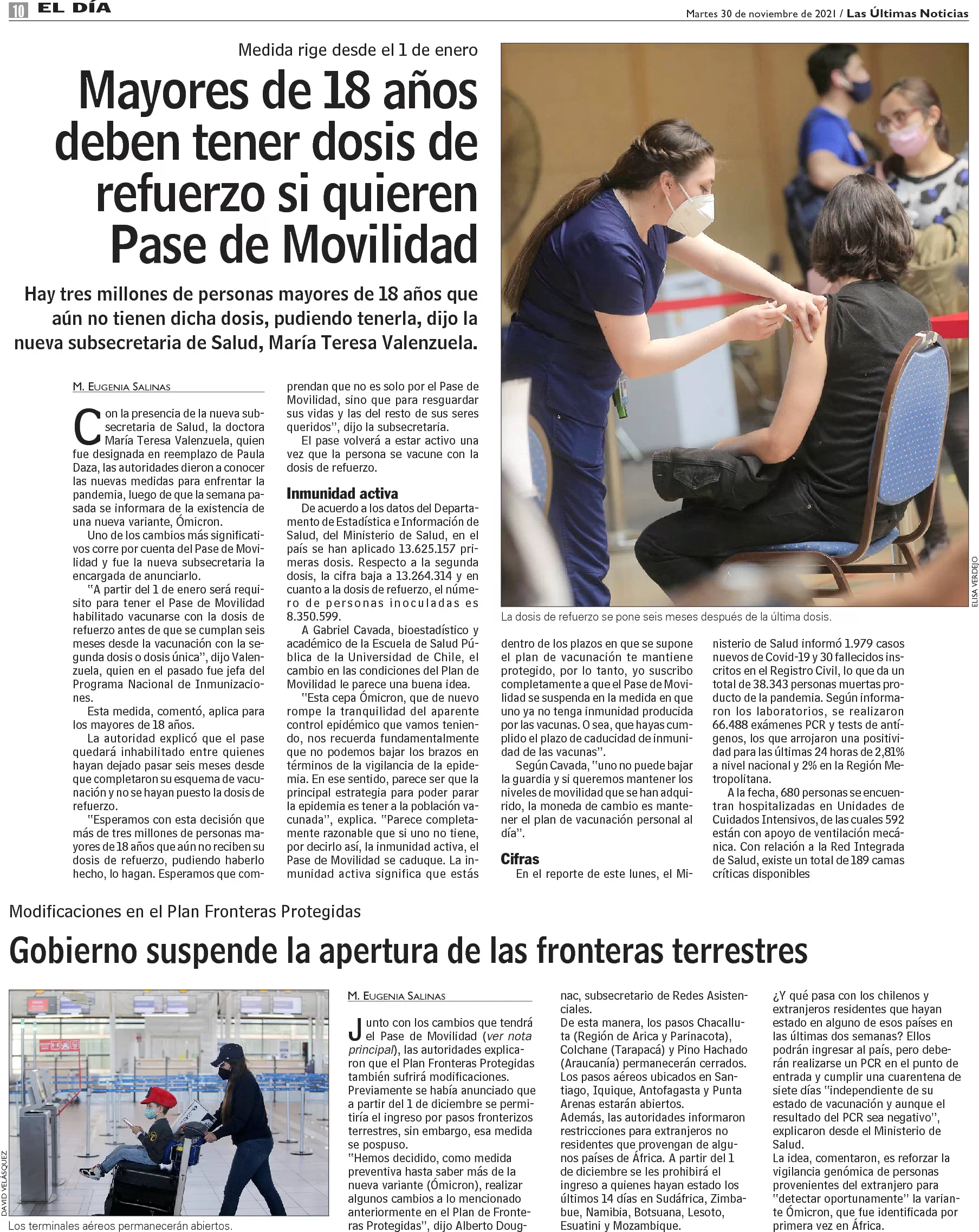 Mayores de 18 años deben tener dosis de refuerzo si quieren Pase de Movilidad