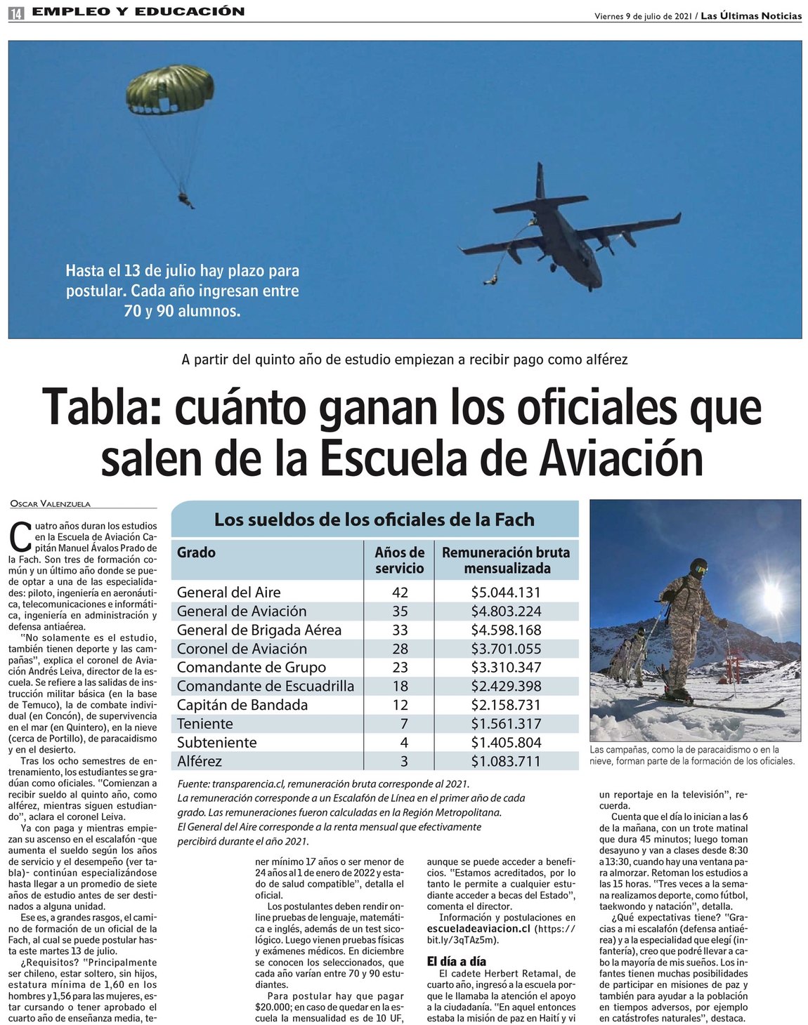 Tabla: cuánto ganan los oficiales que salen de la Escuela de Aviación
