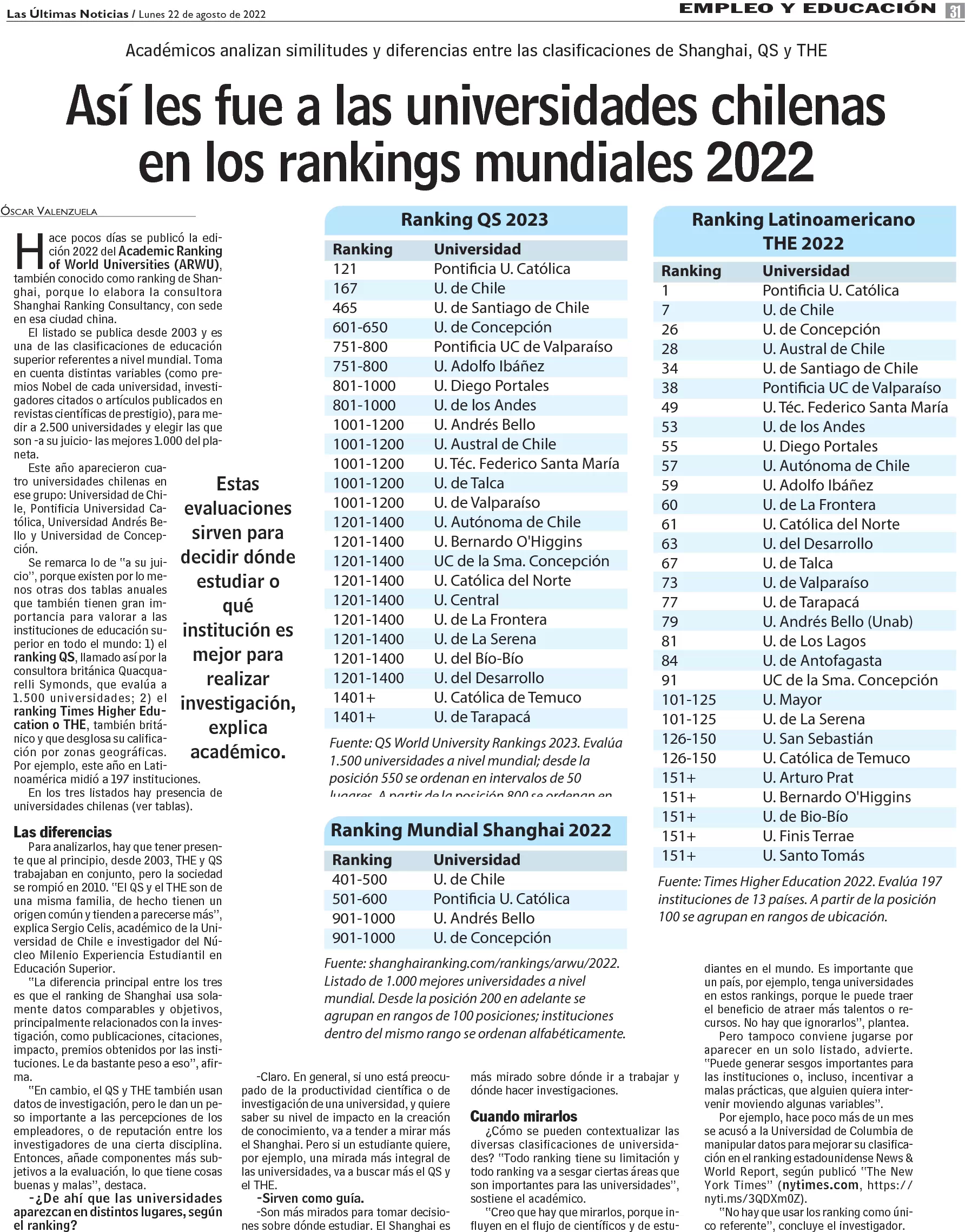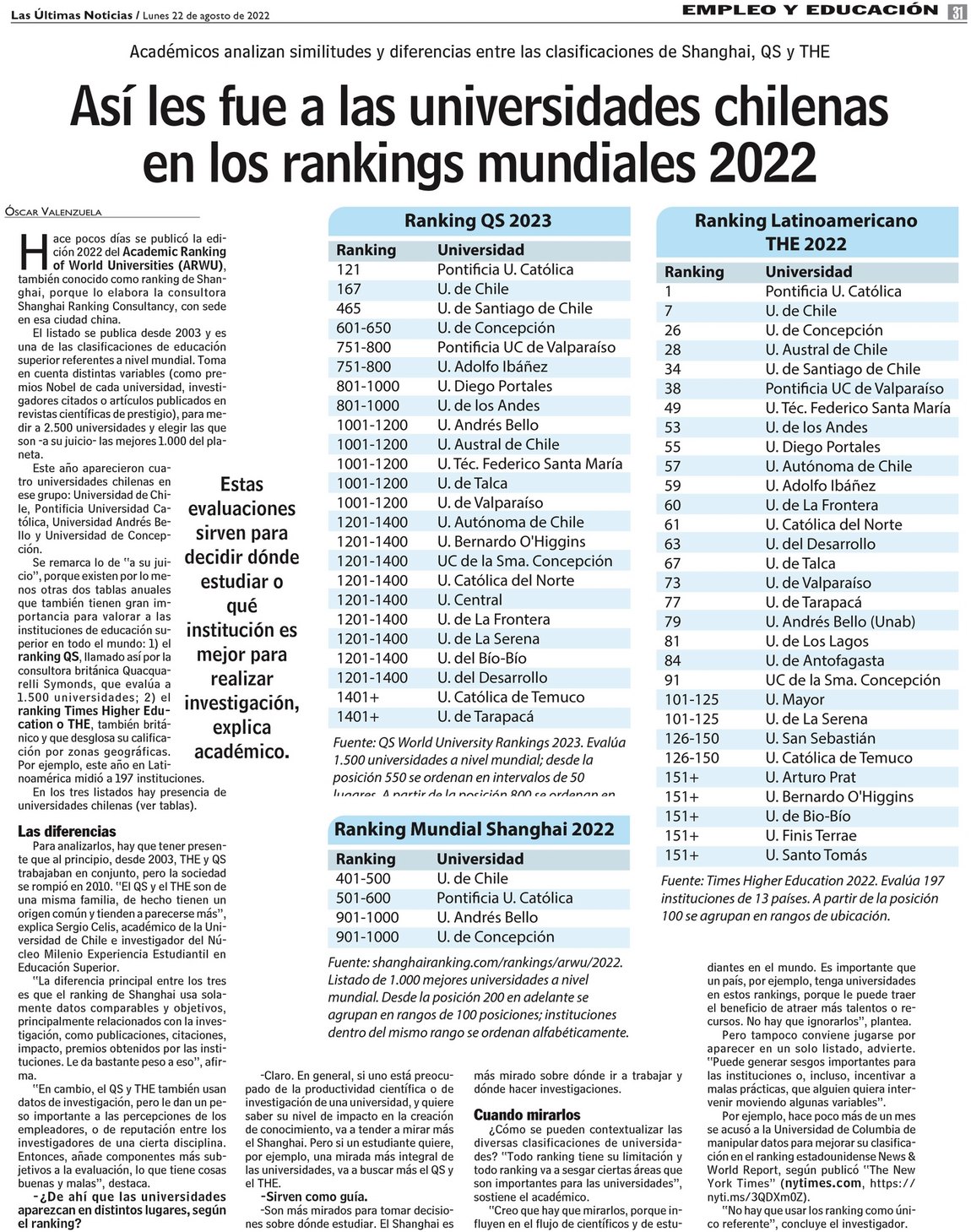 Así les fue a las universidades chilenas en los rankings mundiales 2022