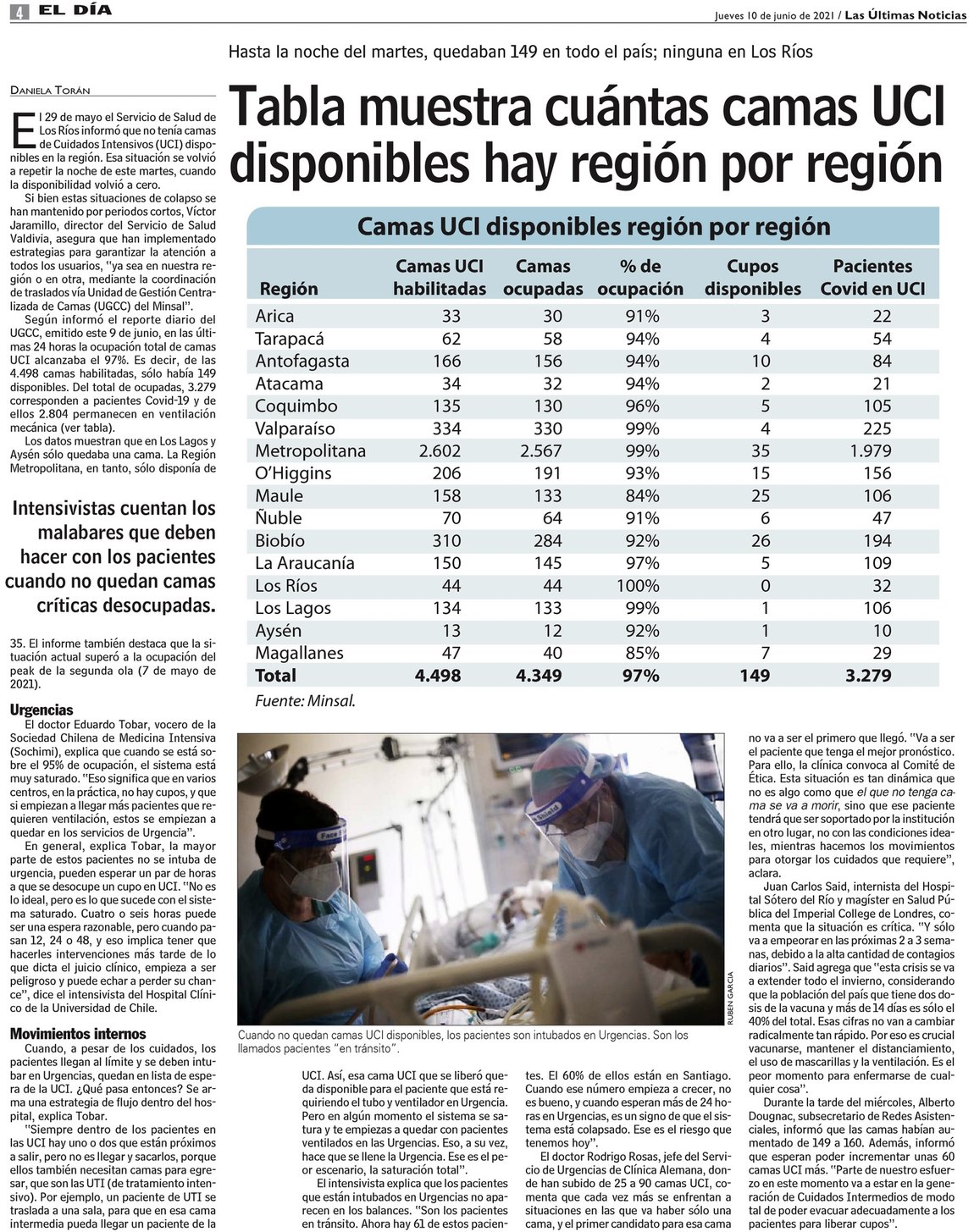 Tabla muestra cuántas camas UCI disponibles hay región por región