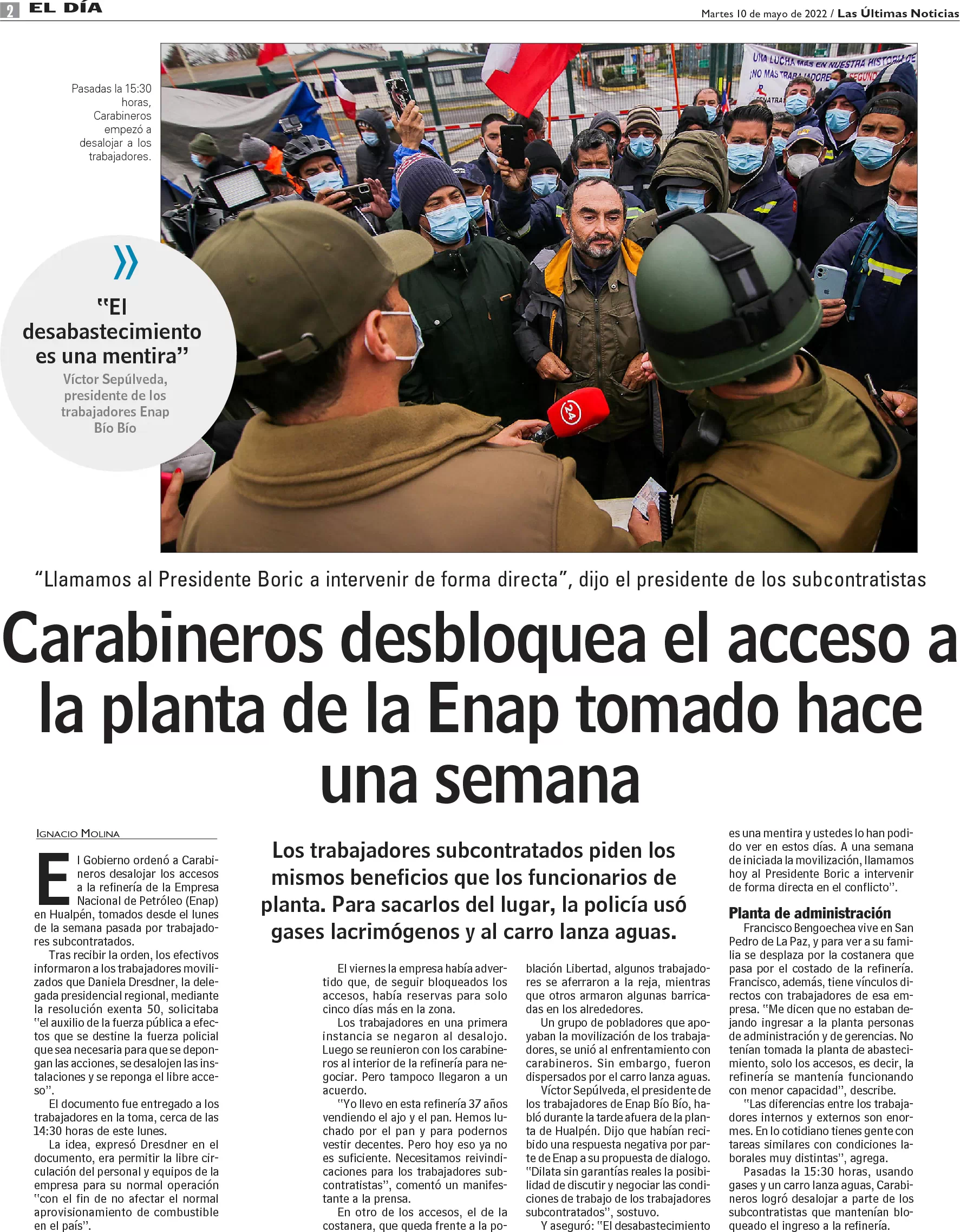 Carabineros desbloquea el acceso a la planta de la Enap tomado hace una semana