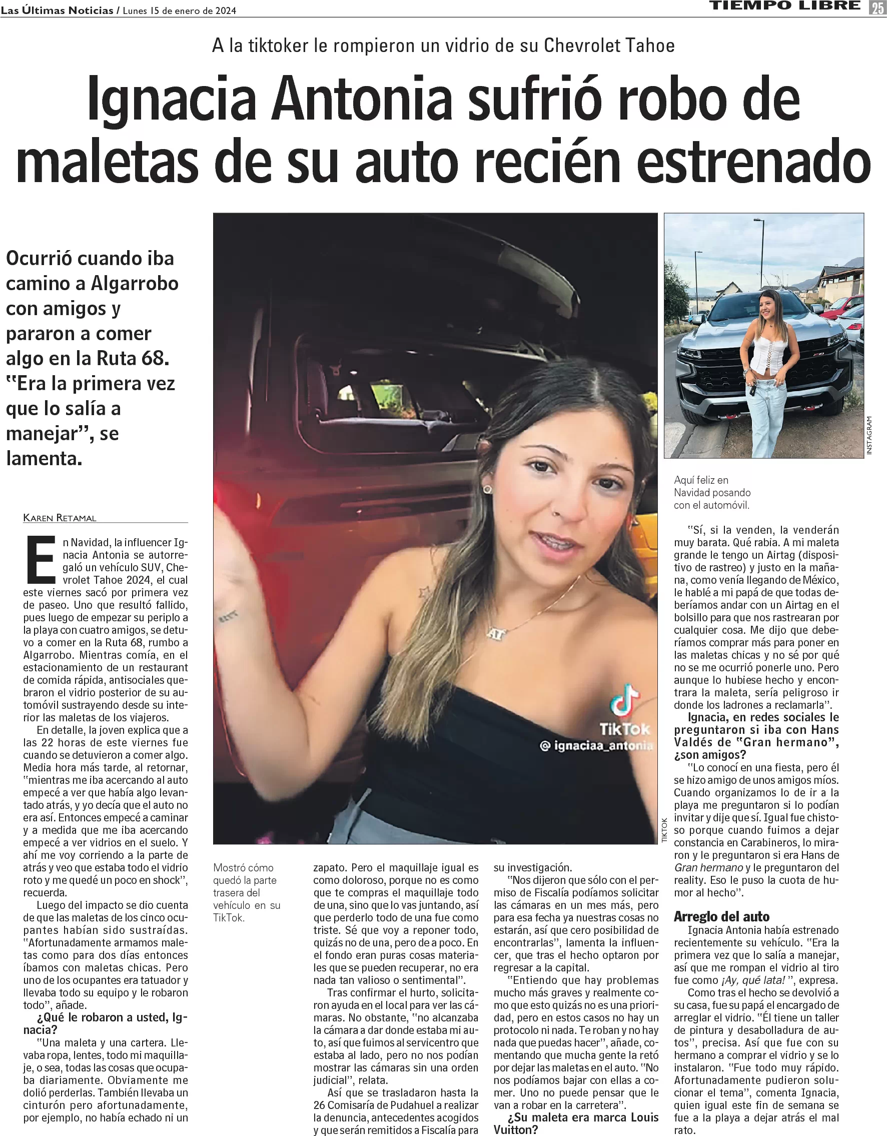 Ignacia Antonia sufrió robo de maletas de su auto recién estrenado