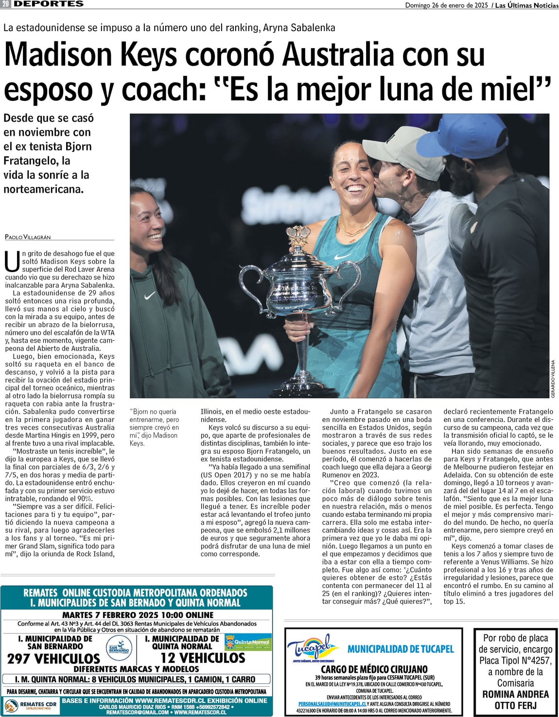 Madison Keys coronó Australia con su esposo y coach: "Es la mejor luna de miel"