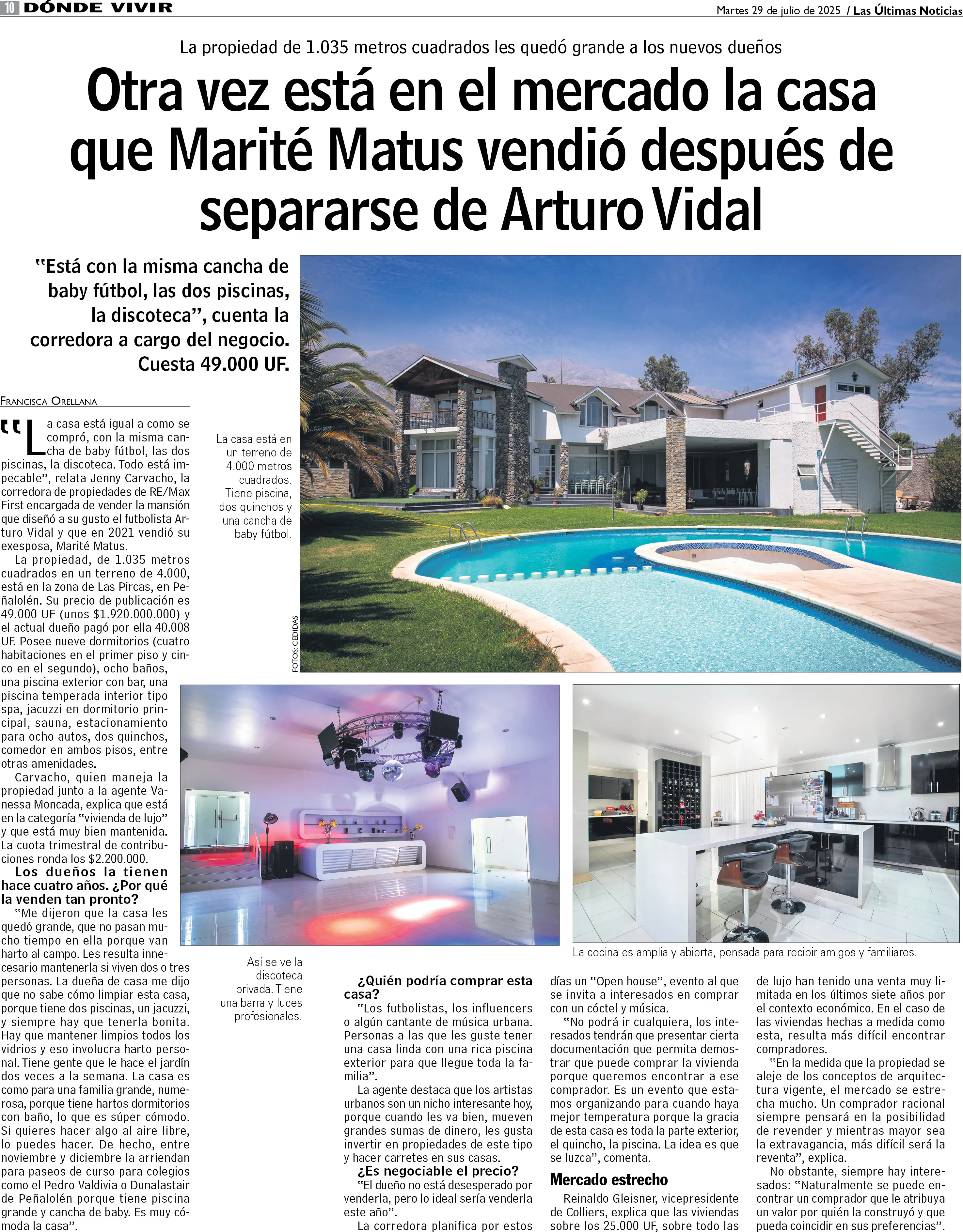 Otra vez está en el mercado la casa que Marité Matus vendió después de separarse de Arturo Vidal