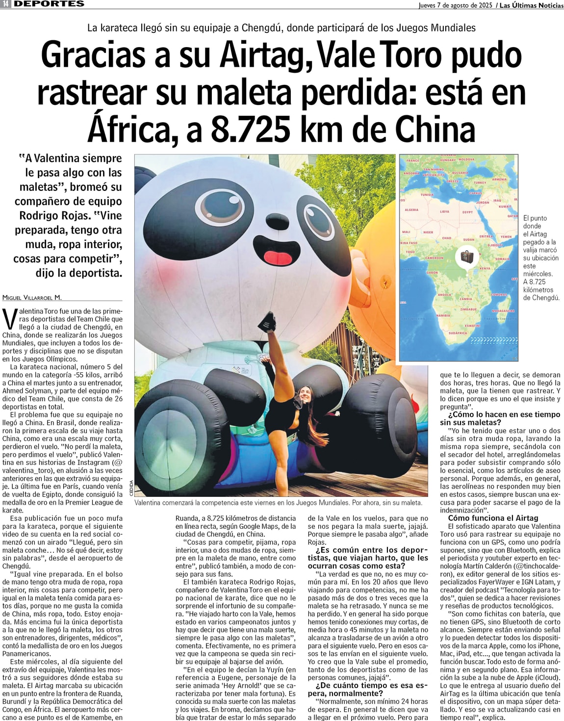 Gracias a su Airtag, Vale Toro pudo rastrear su maleta perdida: está en África, a 8.725 km de China