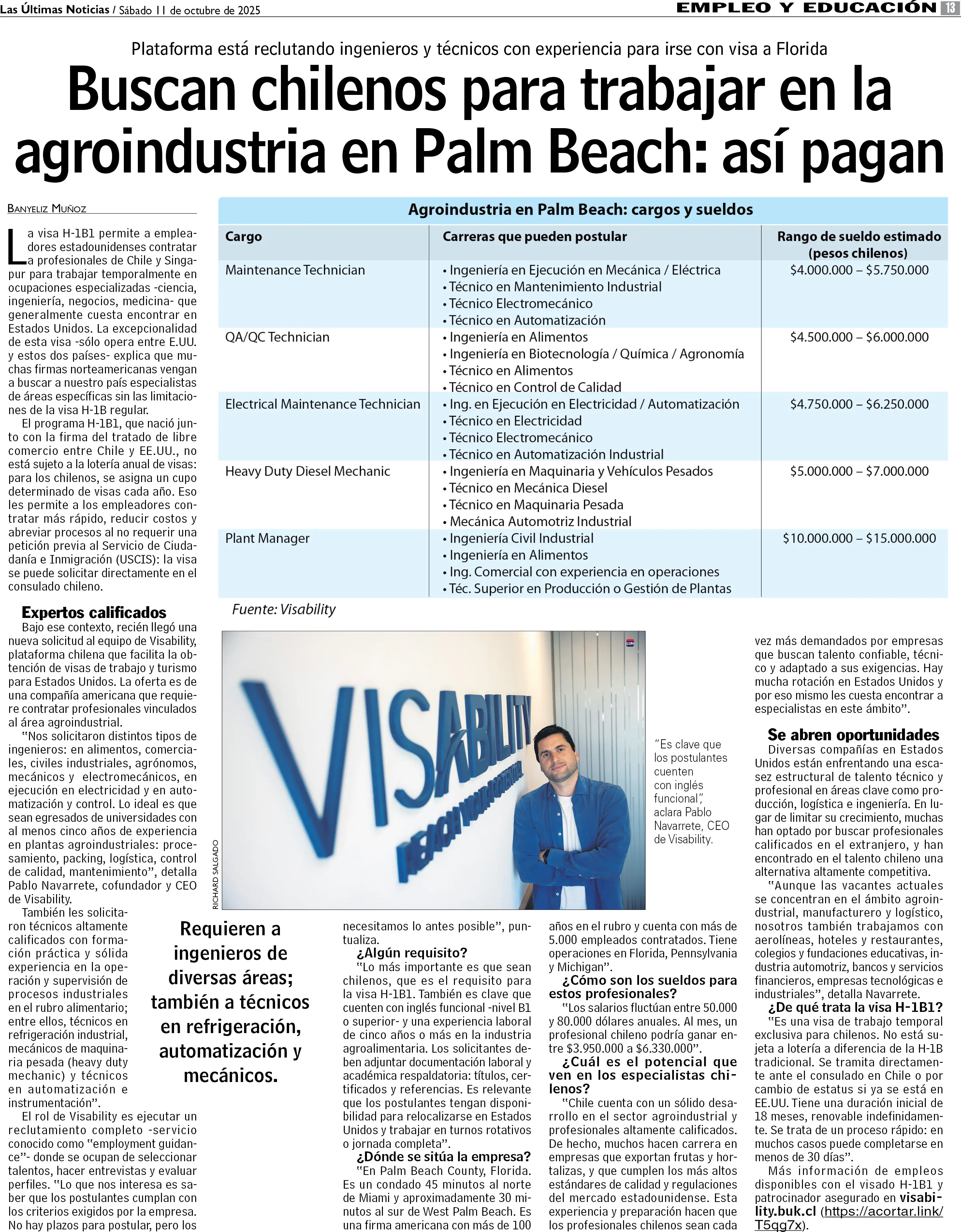 Buscan chilenos para trabajar en la agroindustria en Palm Beach: así pagan